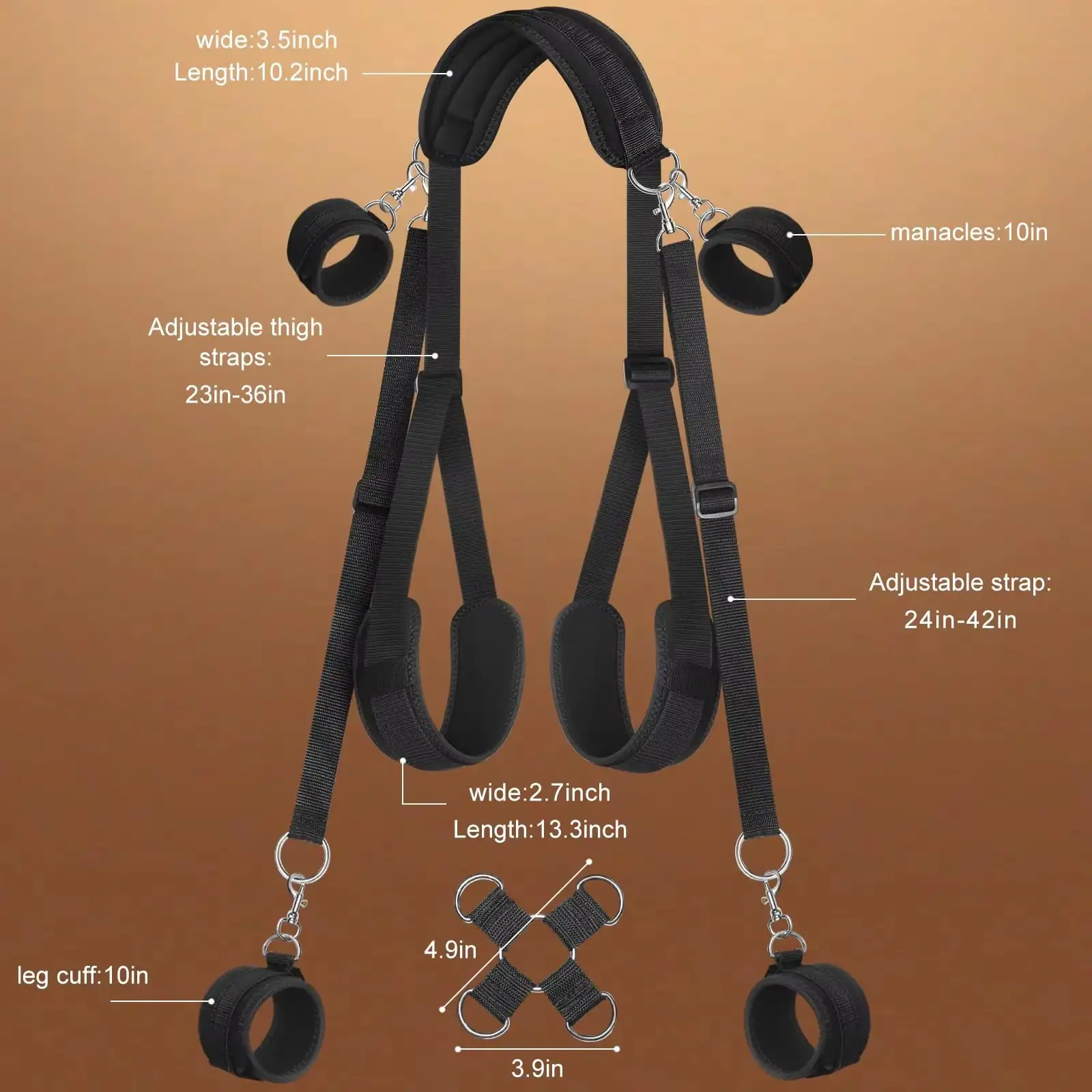 A: The set includes a complete body harness, hand and ankle cuffs, and connecting straps — everything you need for full-body restraint without needing to purchase additional accessories.